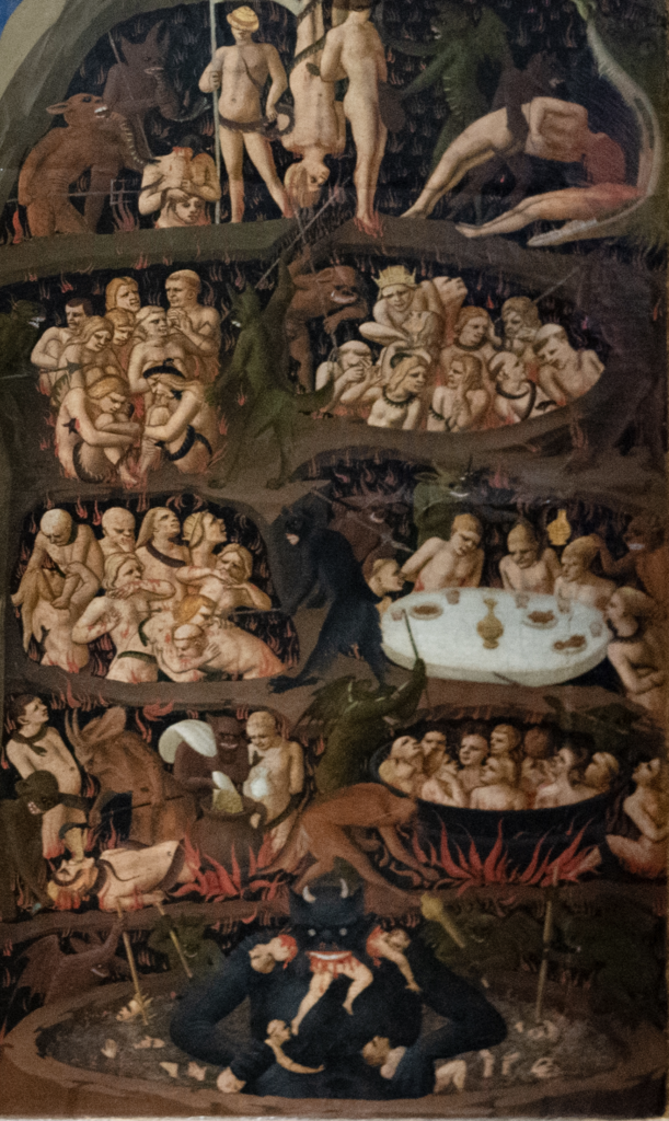 Na prawym skrzydle obrazu widzimy piekło z jego poziomami. Grzesznicy są poddawani mękom, wśród których są typowe, aż wyświechtane, jak wieszanie za nogi, kaleczenie ostrymi przedmiotami czy gotowanie w kotle. Są też wyrafinowane, jak dręczenie głodnych i spragnionych potrawami i napojami, po które nie mogą sięgnąć. Jak by nie patrzeć, wszyscy grzesznicy są doprawieni do smaku torturami, bo na samym dnie piekła pożera ich trzygębny szatan. W paszczach Lucyfera nadgryzani są – jak uważa autor „Boskiej komedii” Dante Alighieri – najwięksi zdrajcy ludzkości: w przedniej Judasz – wiemy, kto to; w lewej – Brutus, a w prawej – Kasjusz. Obaj zabójcy Cezara, z którym współpracowali i przyjaźnili się. To o pierwszym, widząc go wśród nożowników,  mordowany powiedział: Et tu, Brute, contra me?. Okrzyk ten na zawsze przeszedł do historii, jak też imię zdrajcy. W szponach szatan trzyma kolejnych dwóch przyjemniaczków, oczekujących na spożycie. Powinniśmy mu współczuć, bo znając upodobania ludzi do grzechu, upasie się nieskończenie, że o niestrawności nie wspomnimy.